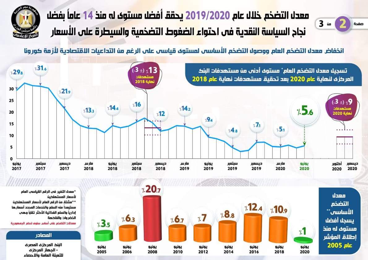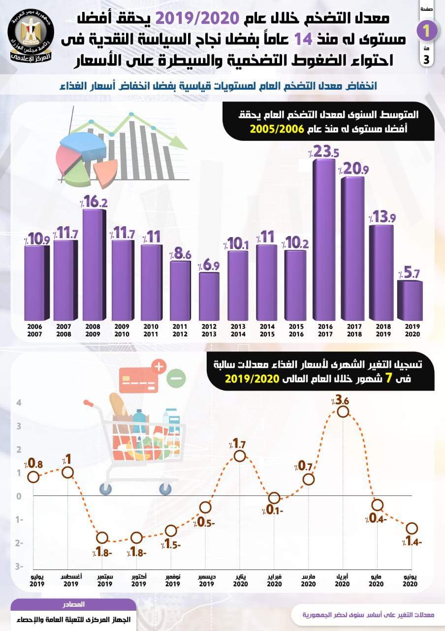 وفي هذا الصدد، أصدر المركز الإعلامي لمجلس الوزراء، تقريراً تضمن إنفوجرافاً سلط من خلاله الضوء على تحقيق معدل التضخم خلال عام 2019/2020 أفضل مستوى له منذ 14 عاماً (2005/2006) بعد انخفاضه لمستويات قياسية بفضل انخفاض أسعار الغذاء.