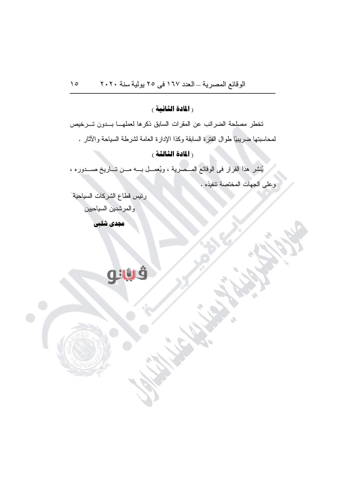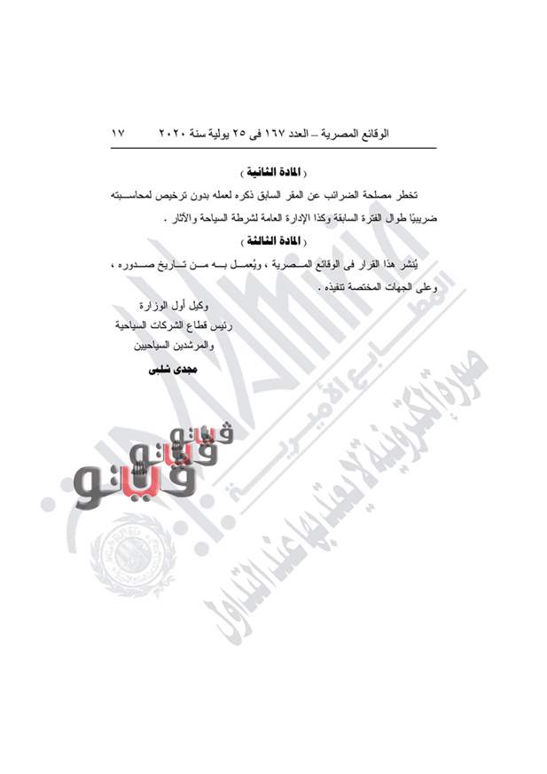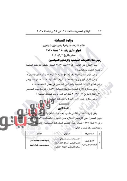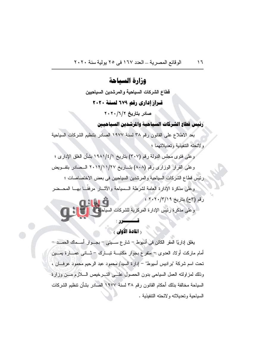 نشرت جريدة الوقائع المصرية في عددها رقم 167، الصادر في 26 يوليو 2020، 3 قرارات لوزارة السياحة بشأن الغلق الإداري لـ5 شركات سياحية في القاهرة والجيزة وأسيوط.