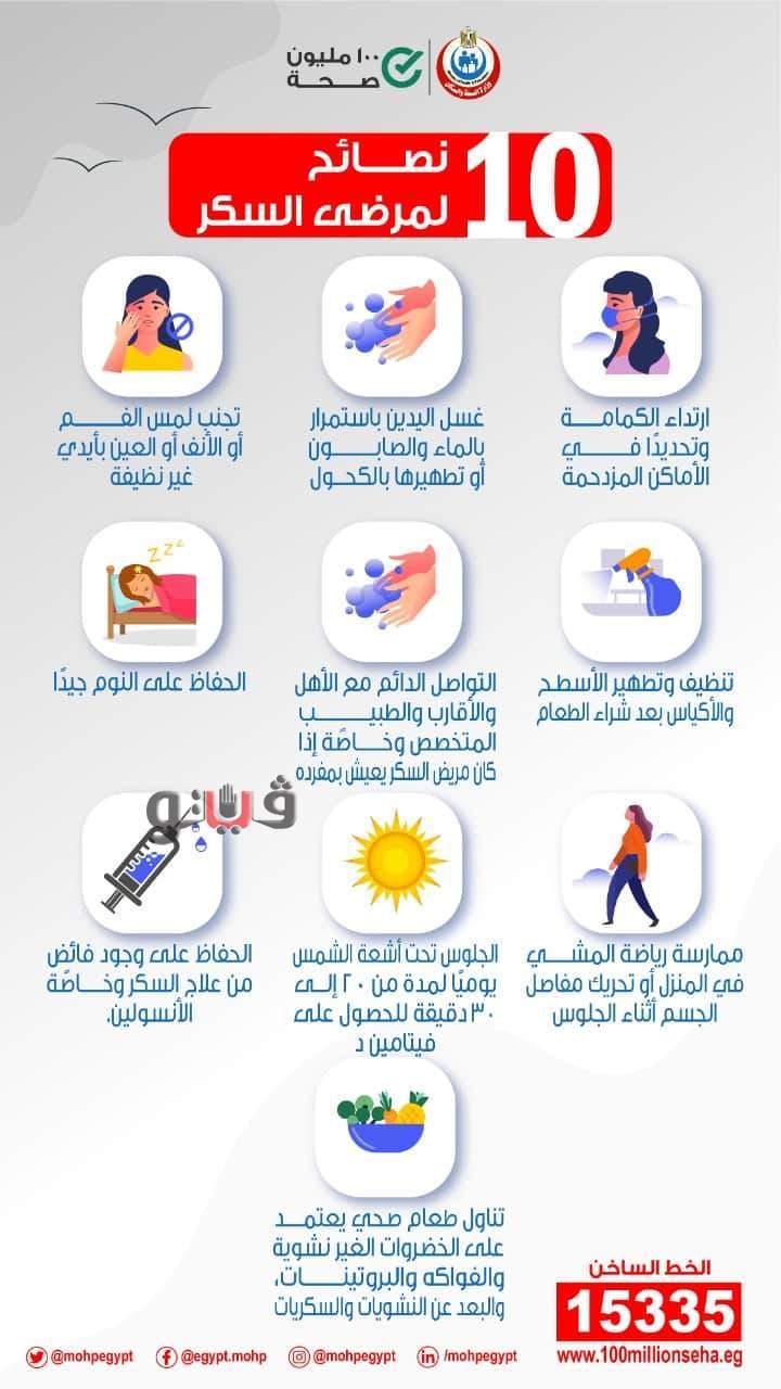 وجهت وزارة الصحة مجموعة نصائح هامة لمرضى السكر منها ارتداء الكمامة تحديدًا في الأماكن المزدحمة وتجنب لمس الأنف أو الفم والحفاظ على النوم جيدا.