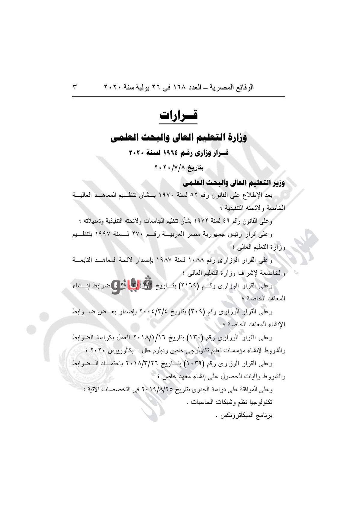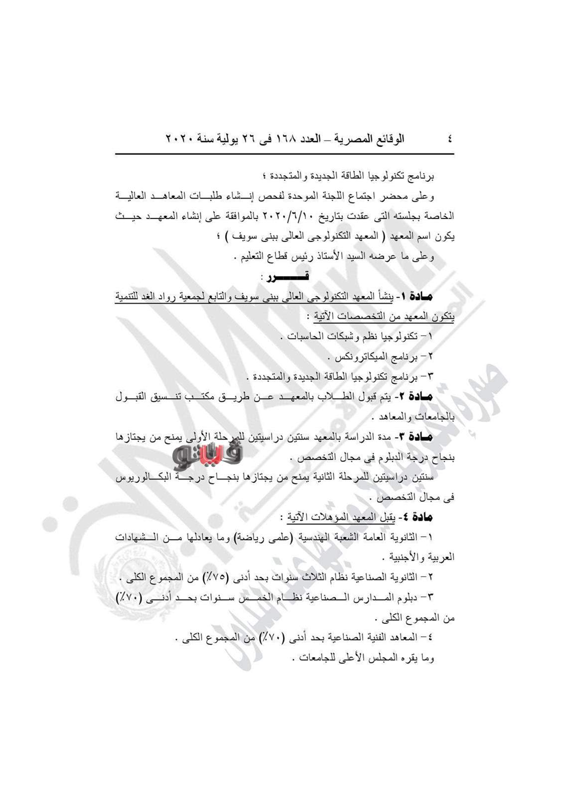 نشرت جريدة الوقائع المصرية في عددها رقم 168، الصادر في 26 يوليو 2020، قرار وزارة التعليم العالي والبحث رقم 1964 لسنة 2020، بشأن إنشاء المعهد التكنولوجي العالي ببني سويف.