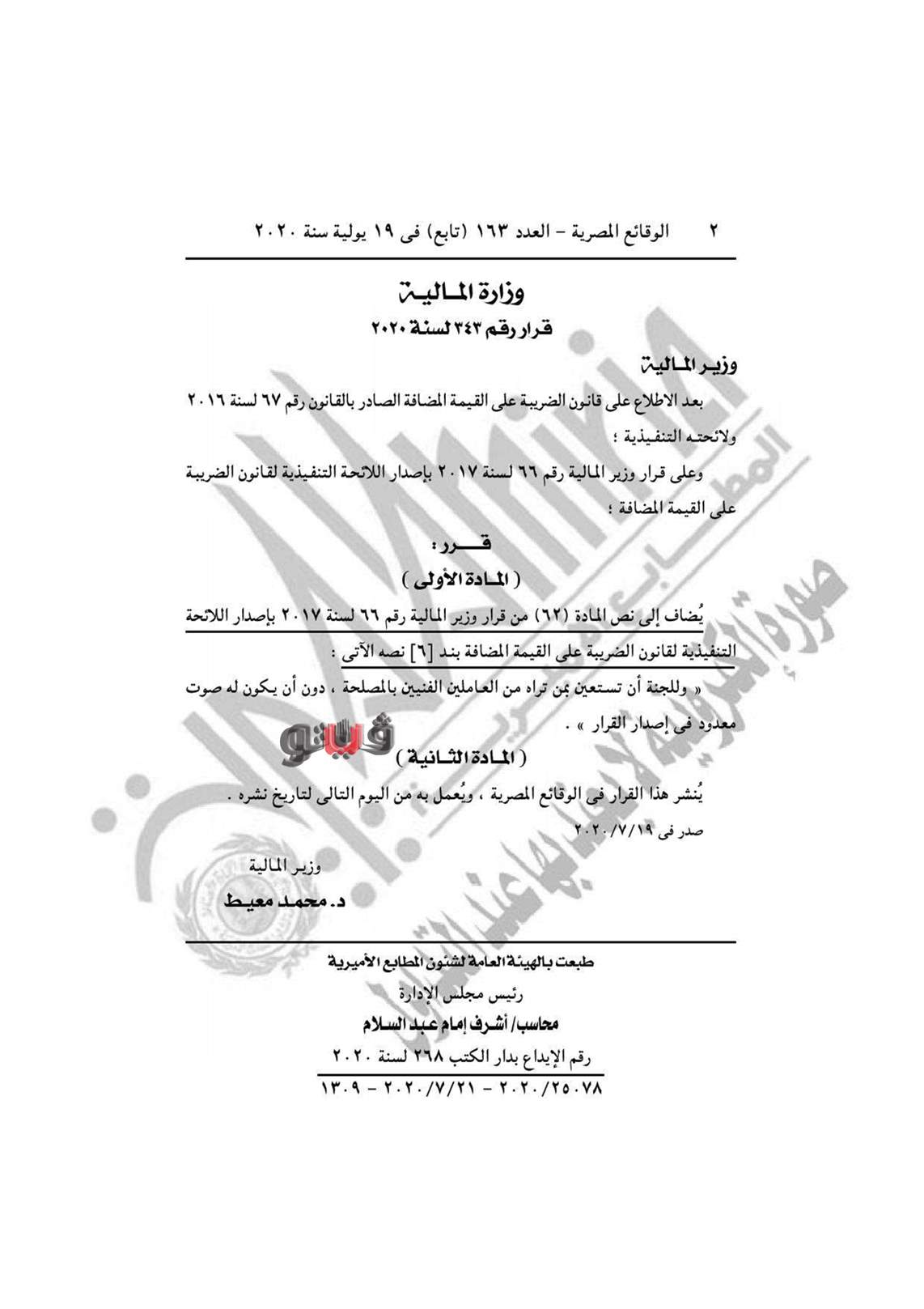 نشرت جريدة الوقائع المصرية في عددها رقم 163 تابع (أ)، الصادر في 19 يوليو 2020، قرار وزارة المالية رقم 344 لسنة 2020، بشأن إضافة لنص المادة 131 بإصدار اللائحة التنفيذية لقانون الضريبة على الدخل بالاستعانة بمن تراه من العاملين الفنيين بالمصلحة، دون أن يكون له صوت معدود في إصدار القرار.
