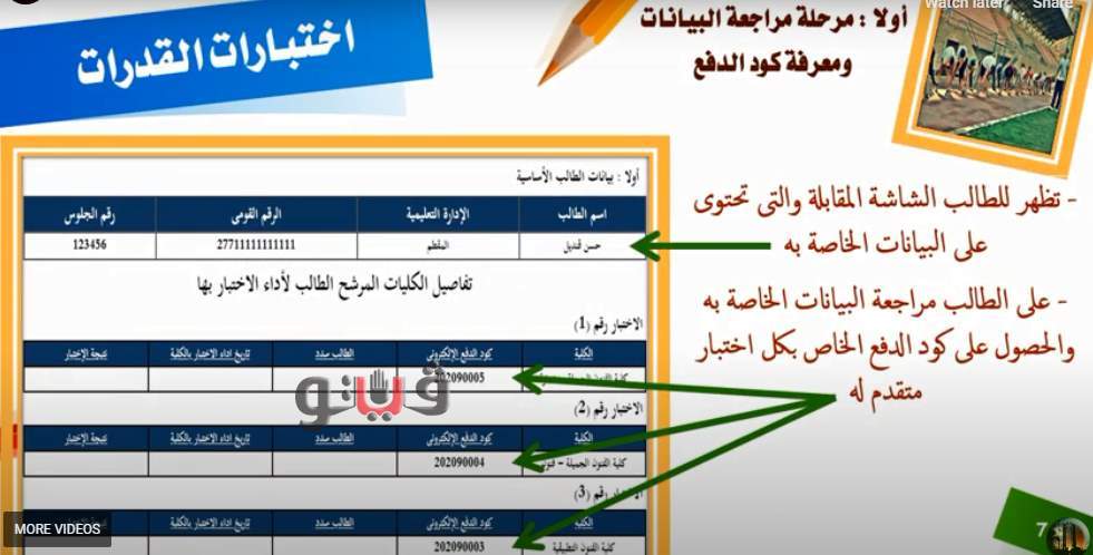 4- يقوم الطالب بمراجعة بياناته و الحصول على كود الدفع الخاص بكل اختبار.