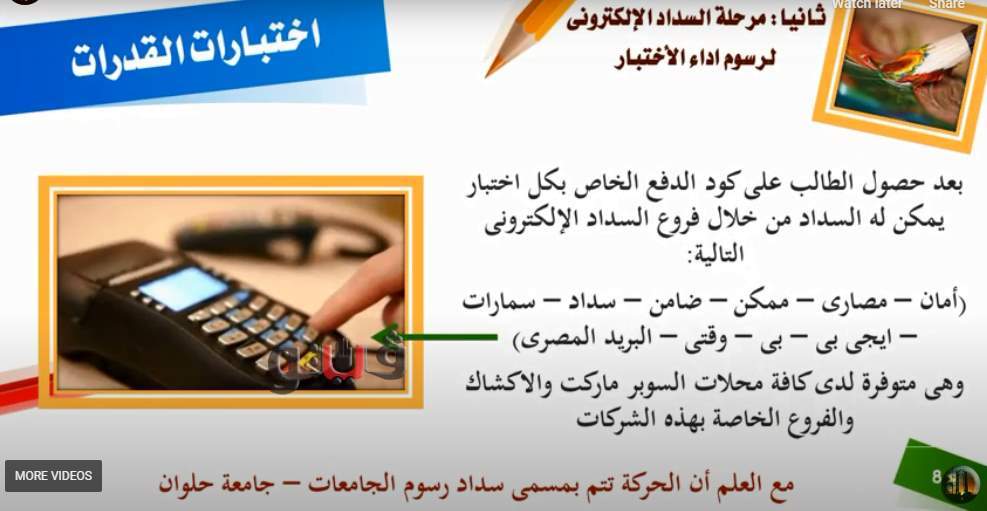 5- يتعين على الطالب سداد رسوم كل اختبار من خلال أحد منافذ سداد الرسوم بكود الدفع وهى (امان - مصارى بى - ايجى باى - ممكن - سداد - سمارت - وقتى - البريد المصرى)، مع العلم بأن الحركة تتم بمسمى سداد رسوم الجامعات - جامعة حلوان.