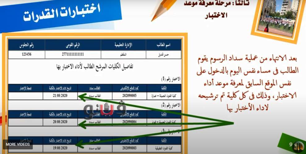 6- بعد إتمام عملية سداد رسوم الاختبار يدخل الطالب على الموقع السابق لمعرفة موعد أداء اختبار القدرات بالكلية باليوم والساعة.