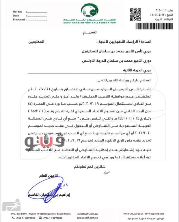 وكتب الحساب الرسمي لصحيفة الجزيرة السعودية، عبر موقع التواصل الاجتماعي "تويتر"، أن الاتحاد السعودي أرسل تعميم لأندية دوري المحترفين والأولى والثانية، يحذر من التعاقد مع وليد أزارو الموسم القادم أو ما يليه من مواسم ممنوع بسبب رفضه تمديد عقده مع الاتفاق حتى نهاية الموسم الحالي.