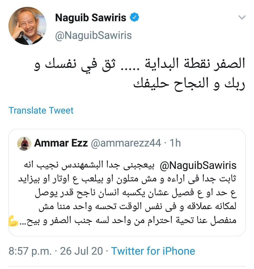 ورد نجيب ساويرس على تعليق أحد متابعيه الذي قال فيه: "بيعجبني جدا الباشمهندس نجيب أنه ثابت جدا في آرائه ومش متلون أو بيلعب على أوتار أو بيزايد على حد أو على فصيل عشان يكسبه إنسان ناجح قدر يوصل لمكانه عملاقة وفي نفس الوقت تحسه واحد مننا مش منفصل عنا تحية احترام من واحد لسه جنب الصفر وبيحلم يوصل لعندك أو يسبقك"، قائلا: "الصفر نقطة البداية.. ثق في نفسك و ربك و النجاح حليفك".