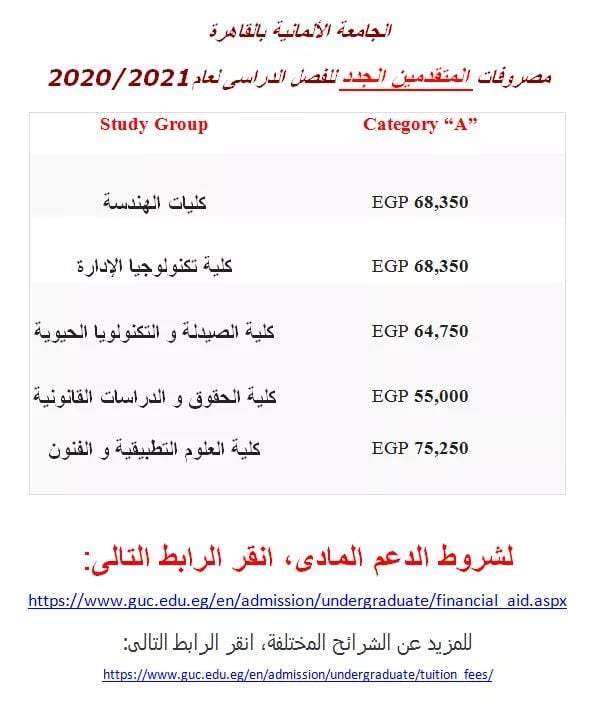 أعلنت الجامعة الألمانية بالقاهرة، مصاريف العام الدراسي الجديد 2020-2021 ، أمام الطلاب المستجدين من طلاب الثانوية العامة وما يعادلها للالتحاق بكليات الجامعة المختلفة.