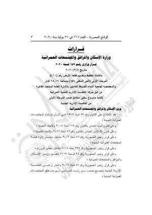 نشرت جريدة الوقائع المصرية في عددها رقم 169، الصادر في 27 يوليو 2020، قرار وزارة الإسكان والمرافق والمجتمعات العمرانية رقم 159 لسنة 2020، باعتماد تخطيط وتقسيم قطعة الأرض رقم (10L) المرحلة الأولى (الحي السكني 8R) بمساحة 26.17 فدان والمخصصة لجمعية النماء للضباط العاملين بالإدارة للتنمية العمرانية، لإقامة مشروع سكني متكامل ضمن المرحلة الأولى من العاصمة الإدارية الجديدة.