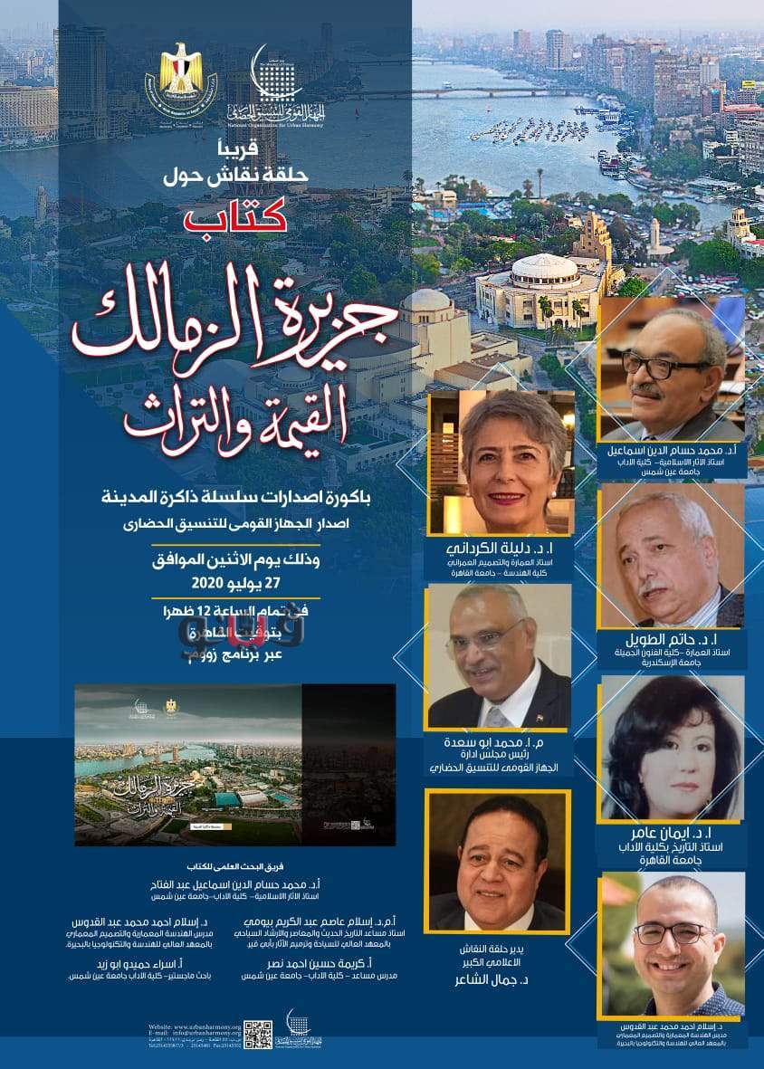 يعقد الجهاز القومى للتنسيق الحضارى ، برئاسة المهندس محمد أبو سعدة، حلقة نقاشية حول كتاب " جزيرة الزمالك القيمة والتراث " باكورة إصدار سلسلة "ذاكرة المدينة" التى أطلقها الجهاز، فى تمام الساعة الثانية عشر ظهر اليوم الاثنين ،أون لاين عبر برنامج زووم الإلكترونى .