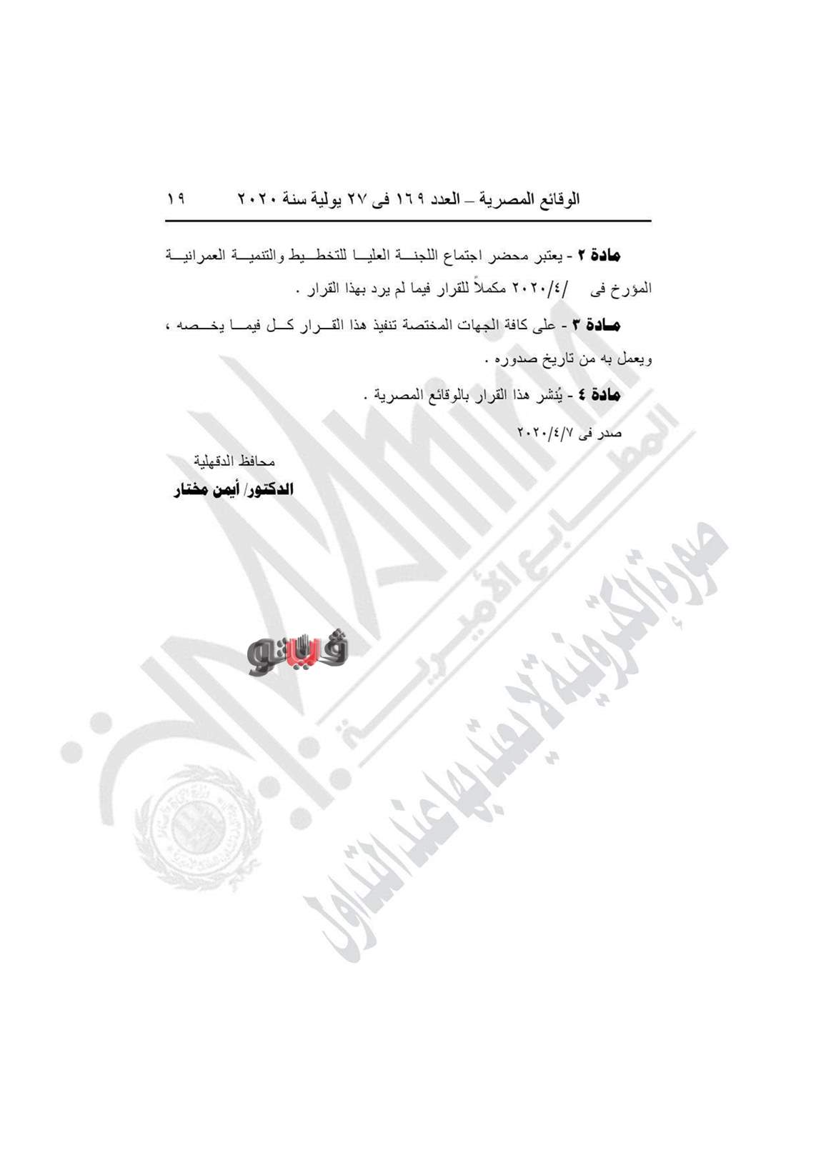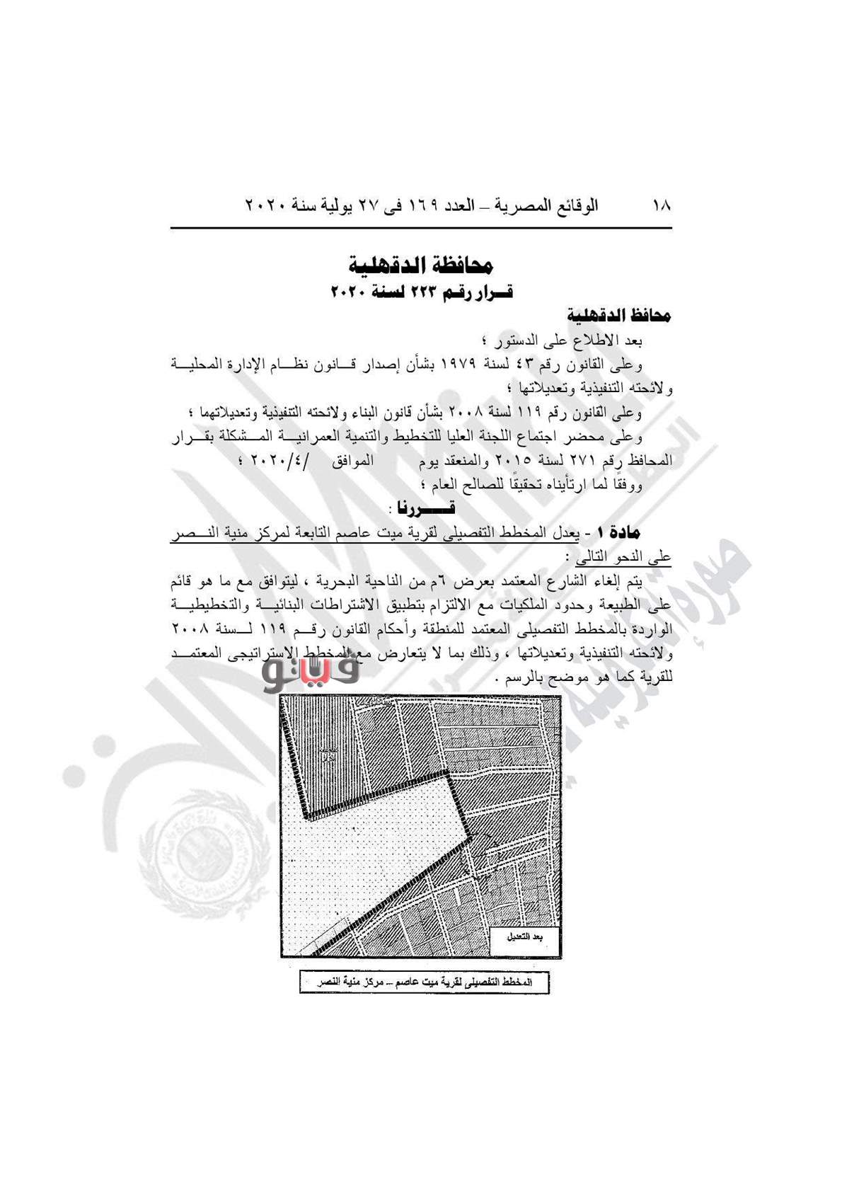 وينص القرار على يعدل المخطط التفصيلي لقرية ميت عاصم التابعة لمركز منية النصر بإلغاء الشارع المعتمد بعرض 6 أمتار من الناحية البحرية، ليتوافق مع ما هو قائم على الطبيعة وحدود الملكيات مع الالتزام بتطبيق الاشتراطات البنائية والتخطيطية.