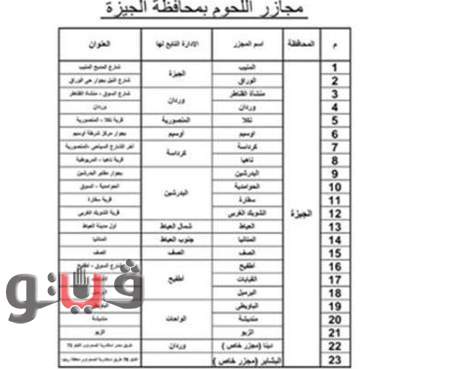 وأكد ان المجازر تشمل مجزر كرداسة باخر الشارع السياحي – المنصورية ومجزر ناهيا بالمريوطية ومجزر البدرشين ومجزر الحوامدية بمنطقة السوق ومجازر سقارة والشوبك الغربي بالبدرشين ومجازر العياط والمتانيا بالعياط ومجازر الصف بالصف ومجزر أطفيح بشارع السوق ومجازر القبابات والبرمبل باطفيح ومجازر الباويطى ومنديشة و الزبو بالواحات البحرية ومجزر رينا" مجزر خاص" بطريق مصر اسكندرية الصحراوي بالكيلو 72 ومجز البشاير " مجزر خاص" بالكيلو 76 طريق مصر اسكندرية الصحراوي منطقة ريجوا .