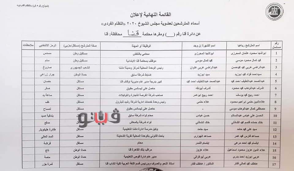 أعلنت محكمة قنا الابتدائية في محافظة قنا، القوائم النهائية للمرشحين الفرديين بعد اضافة مرشح حزب النور، الذي قبل طعنه من خلال حكم محكمة القضاء الإداري.