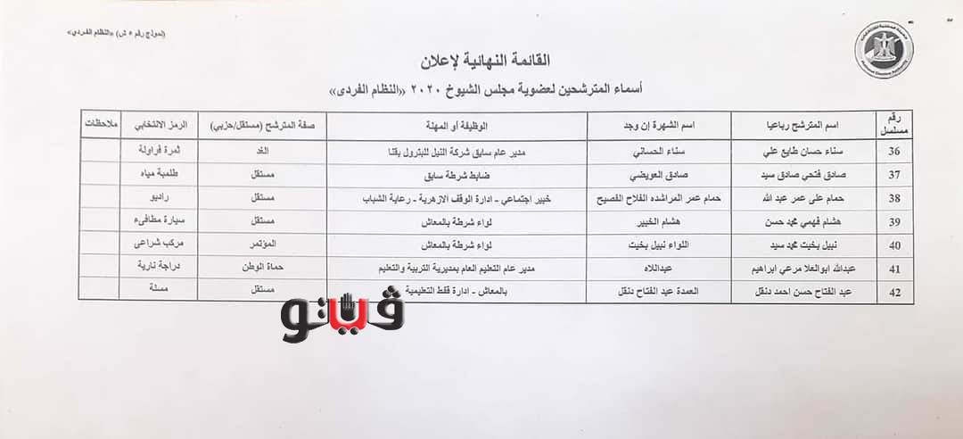 وباضافة المرشح حزب النور، محمود أبوالسعود ، رمز، الفانوس، والذي احتل رقم ٣٢ في القائمة ، لتصل الاعداد النهائية للقائمة إلى ٤٢ مرشحا لخوض انتخابات مجلس الشيوخ يتنافسون على ٣مقاعد فردية.