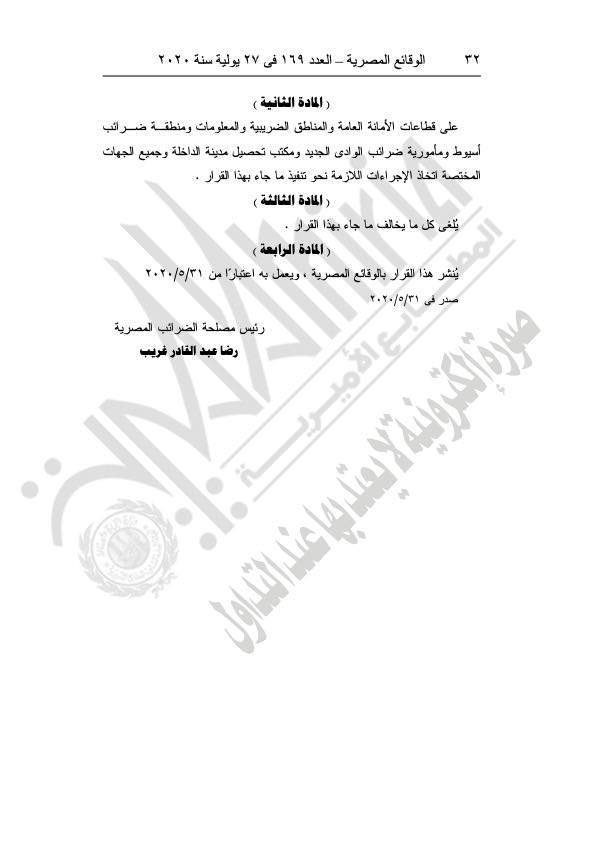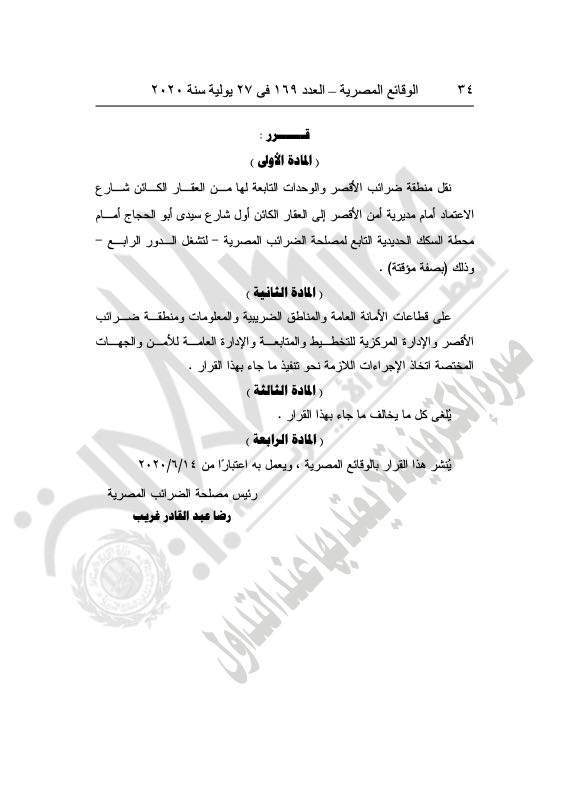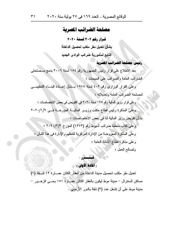 نشرت جريدة الوقائع المصرية في عددها رقم 169، الصادر في 27 يوليو 2020، قرارا مصلحة الضرائب المصرية بشأن تعديل مقر مكتب الداخلة، نقل منطقة ضرائب الأقصر والوحدات التابعة لها.