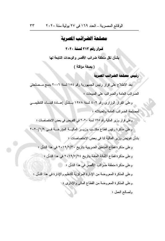 والقرار رقم 313 لسنة 2020، بشأن نقل منطقة ضرائب الأقصر والوحدات التابعة لها (بصفة مؤقتة)