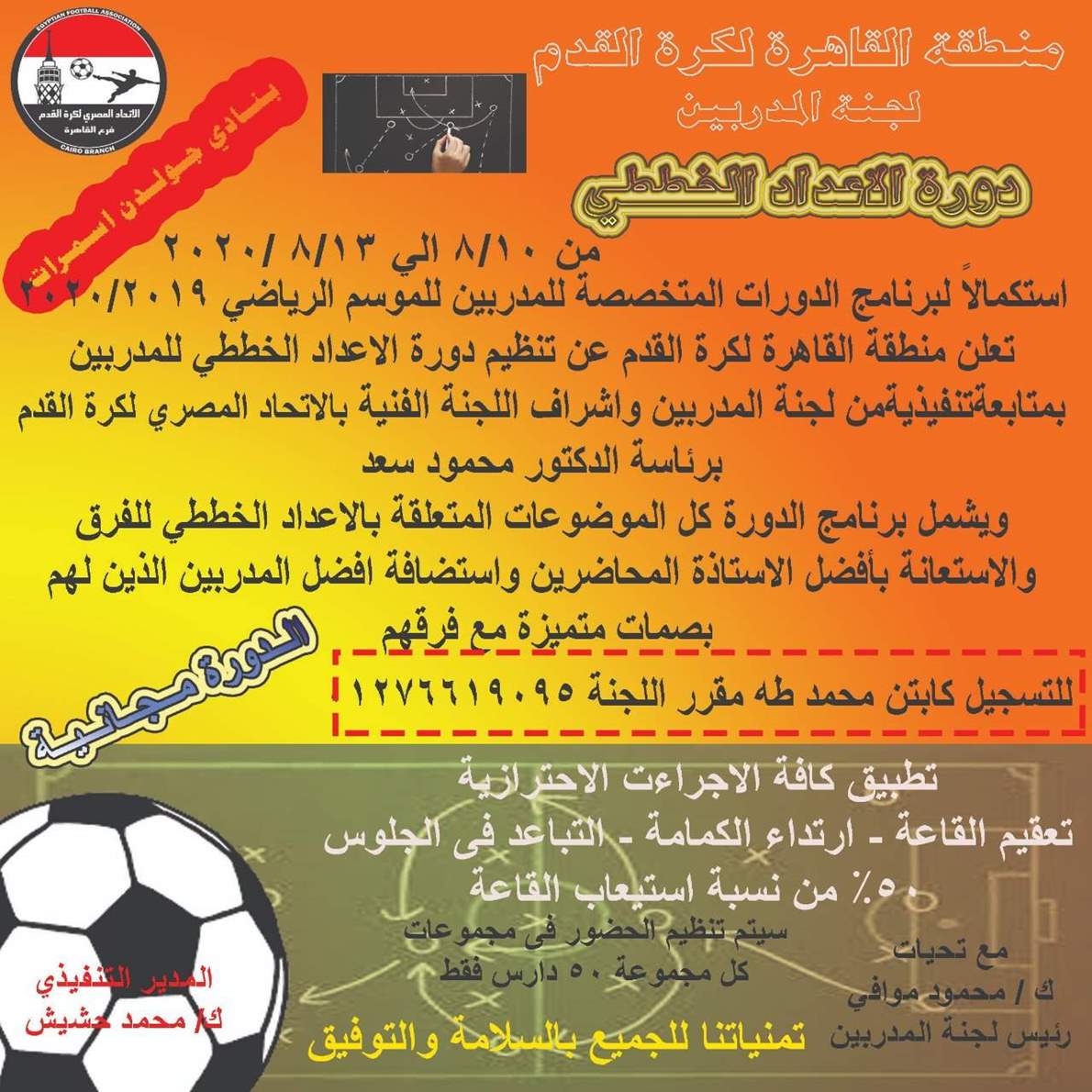 وتقام دورة الاعداد الخططي للمدربين استكمالا لبرنامج الدورات المتخصصة للموسم الجاري والتي تنظمها منطقة القاهرة ومتابعة تنفيذية من لجنة المدربين بالمنطقة بقيادة محمود موافي وأعضاء اللجنة ومحمد طه مقرر اللجنة وتحت إشراف اللجنة الفنية بإتحاد الكرة برئاسة الدكتور محمود سعد.