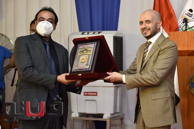 والتكنولوجيا كل من حسام عبد الغفار ورجل الأعمال حسن راتب بإهداء درع جامعة مصر للعلوم والتكنولوجيا لهما.