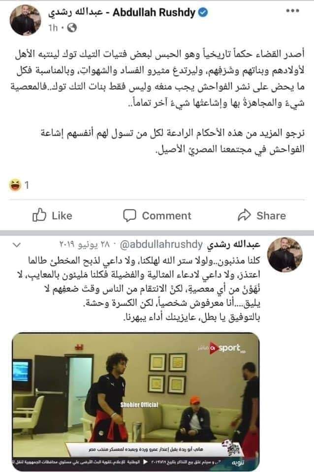 وأدان الشيخ عبد الله رشدي أفعال فتيات التيك توك في تدوينة له على الفيس بوك قال فيها: "أصدر القضاء حكماً تاريخياً وهو الحبس لبعض فتيات التيك توك لينتبه الأهل لأولادهم وبناتهم وشَرَفِهم، وليرتدعَ مثيرو الفساد والشهواتِ، وبالمناسبة فكل ما يحض على نشر الفواحش يجب منعُه وليس فقط بنات التك توك..فالمعصية شيءٌ والمجاهرَةُ بها وإشاعتُها شيءٌ آخر تماماً.."