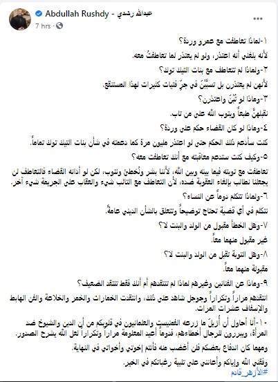 وكان الداعية الإسلامي عبدالله رشدي قد أثار جدلًا، مؤخرًا، حيث تصدر اسمه مواقع التواصل بسبب تدوينة له غعلى الفيس بوك يدلي فيه برأيه عن التحرش قائلًا: "ليس من الطبيعي أن تخرج فتاةٌ بملابس لا تصلح إلا للنوم ثم تشكو من التحرش لكنه عاد وقال "إنه لا يبرر التحرش ولا يعفي المتحرش من العقوبة"
