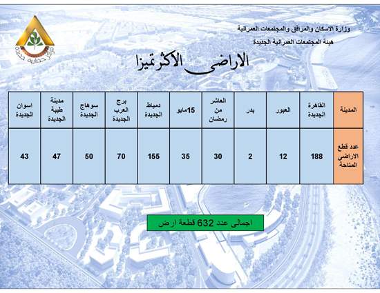 تطرح وزارة الإسكان ممثلة فى هيئة المجتمعات العمرانية الجديدة، 632 قطعة أرض سكنية بالإسكان "الأكثر تميزا" بعدد من المدن الجديدة.