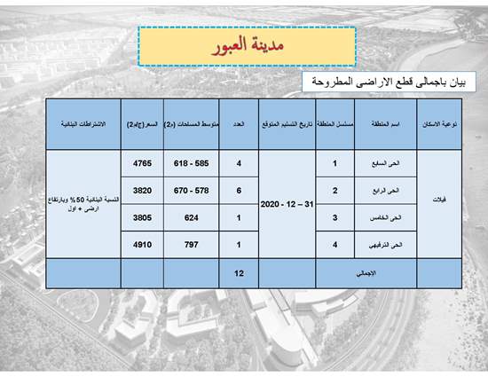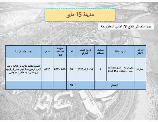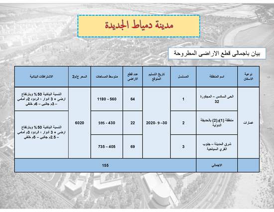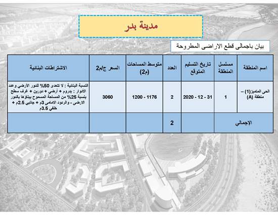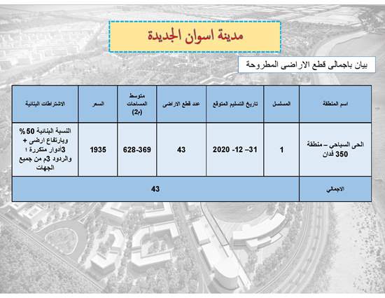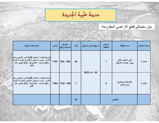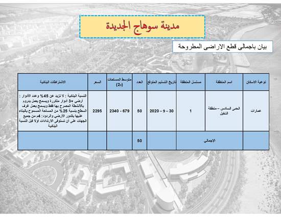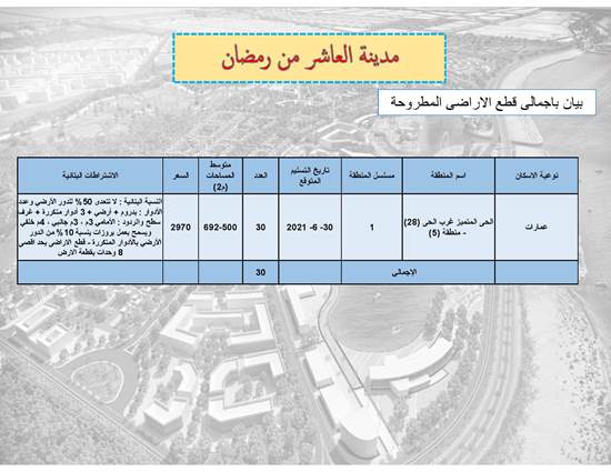 وننشر كراسة شروط حجز الاراضى، وتتراوح مساحات الأراضى من 294 مترا : 2300 متر، بـ10 مدن جديدة وهى :