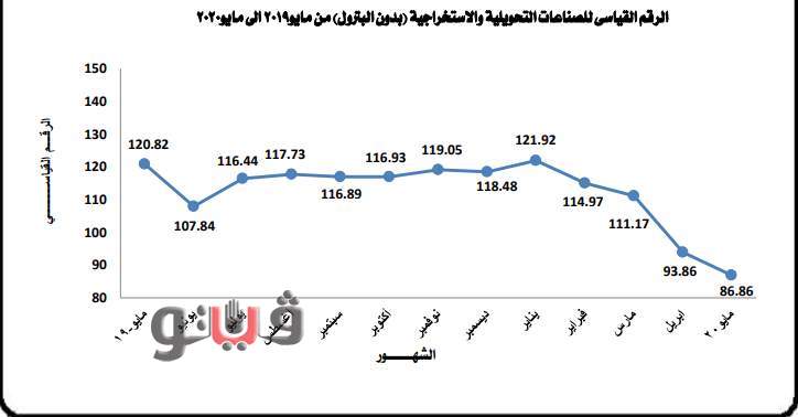 بلغ الرقم القياسي للصناعات التحويلية والاستخراجية (بدون الزيت الخام والمنتجات البترولية) 86.86 خلال شهر مايو 2020 (أولـي) مقابل 93.86 خلال شهر ابريل 2020 (نهائي) بنسبة انخفاض قدرها 7.5٪. وذلك طبقا لتقرير البيانات الأولية للرقم القياسي لإنتاج الصناعات التحويلية والاستخراجية عن شهـر مايو 2020 الصادرة عن الجهاز المركزي للتعبئة العامة والإحصــاء .