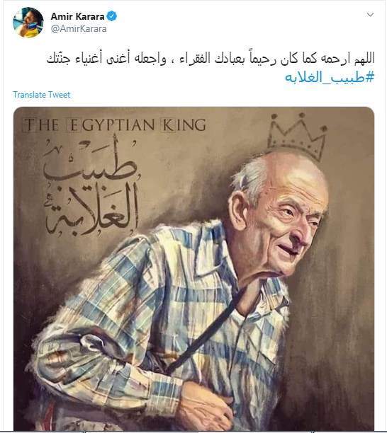 وكتب أمير كرارة تغريدة على تويتر "اللهم ارحمه كما كان رحيماً بعبادك الفقراء، واجعله أغنى أغنياء جنّتك #طبيب_الغلابه"
