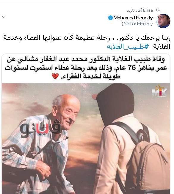 وقال هنيدي في تغريدة نشرها على صفحته الرسمية بـتويتر: ربنا يرحمك يا دكتور ، رحلة عظيمة كان عنوانها العطاء وخدمة الغلابة.