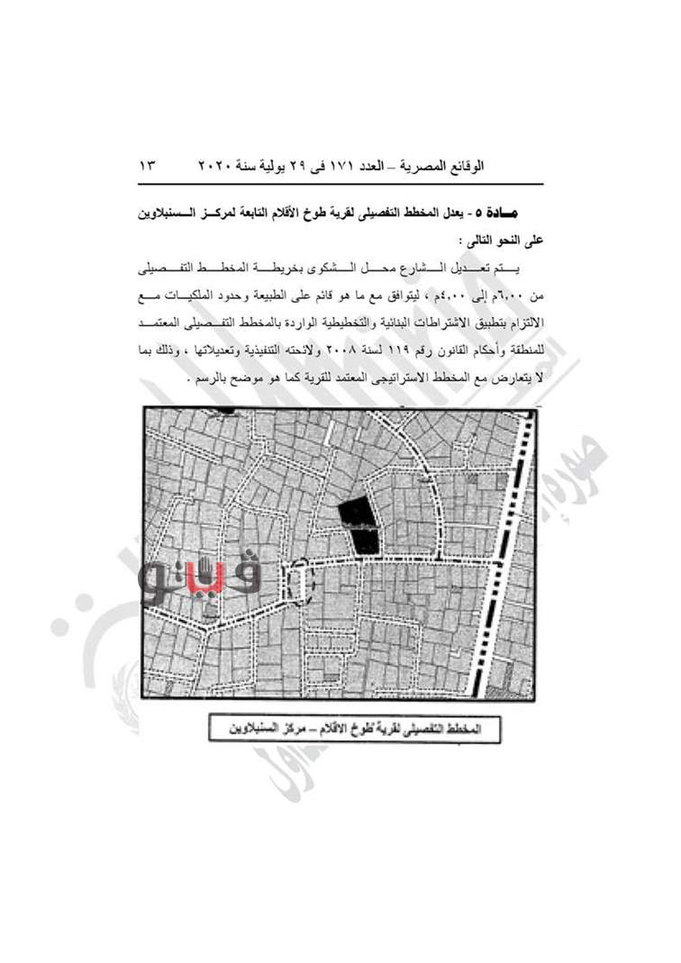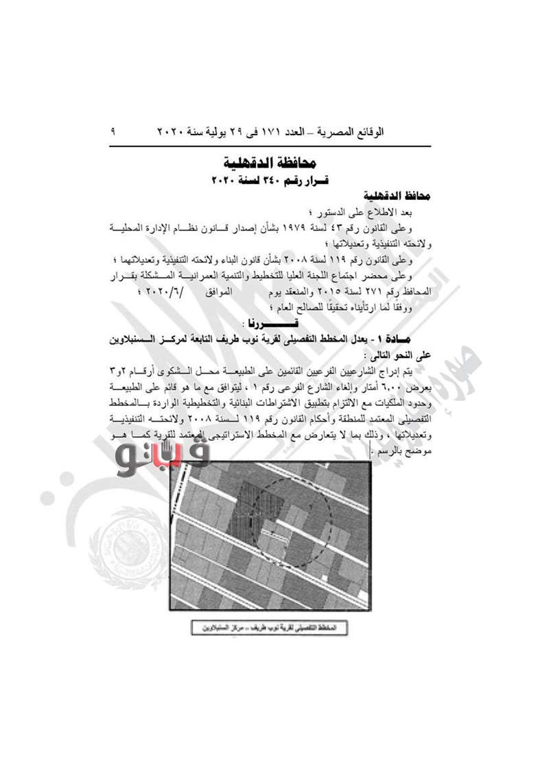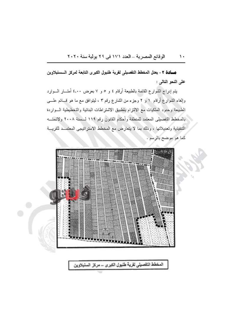 نشرت جريدة الوقائع المصرية في عددها رقم 171، الصادر في 29 يوليو 2020، قرار محافظة الدقهلية رقم 340 لسنة 2020، بتعديل المخطط التفصيلي لـ5 قرى تابعين لمركز السنبلاوين.