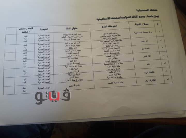 وتضم تلك المنافذ 3 منافذ داخل مدينة الإسماعيلية وهي منافذ نادي المنتزة ومديرية الزراعة ، ومنفذ التربية والتعليم ، و3 منافذ بأبوصوير وهي منافذ مدخل أبوصوير البلد ، وعزبة دقينش ، و منفذ بوابة المطار ، و3 منافذ بمدينة القصاصين منفذ المدينة ومنفذ المحسمة القديمة والمحسمة الجديدة ، بالإضافة إلى منافذ التل الكبير و 3 منافذ منفذ نقطة الحمادة والمحسمة الجديدة ومنفذ تل البلد، بالإضافة لمنافذ بيع اللحوم بالقنطرتين 3 بالقنطرة شرق منفذ المدينة القديمة ، والقنطرة غرب منفذ ابو خليفة ، ومنفذي قرية النصر والوحدة المحلية ، وبالإضافة إلي منافذ بيع اللحوم بمركز فايد والتي تبلغ 3 منافذ منفذ بالوحدة المحلية ومنفذ بقرية فنارة ومنفذ بقرية فايد.