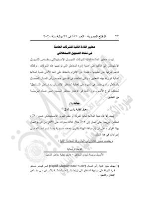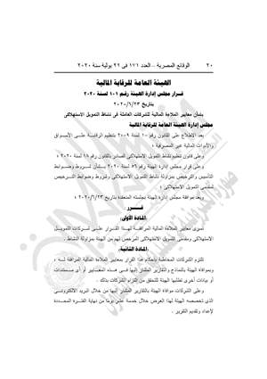 وقرارا الهيئة العامة للرقابة المالية رقم 101 و109 لسنة 2020، بشأن معايير الملاءة المالية للشركات العاملة في نشاط التمويل الاستهلاكي.