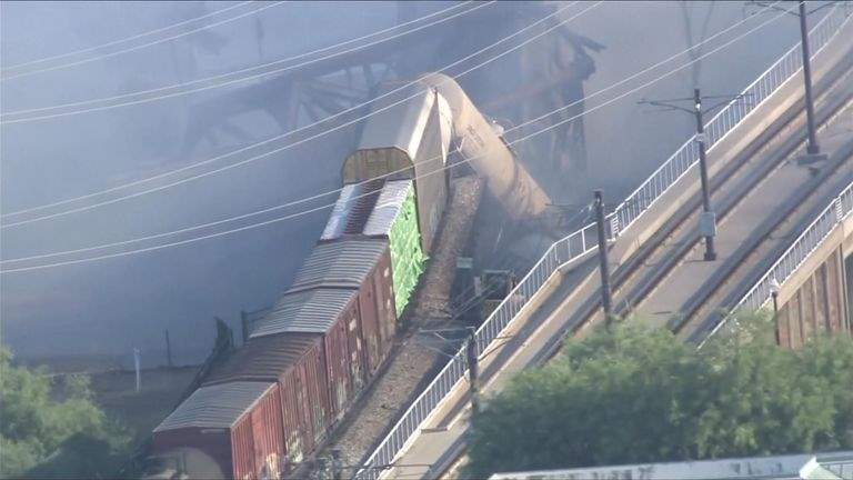 أفادت وسائل إعلام أمريكية بخروج قطار شحن عن مساره في ولاية أريزونا مساء اليوم الأربعاء ما أسفر عن نشوب حريق هائل وانهيار جزء من جسر.
