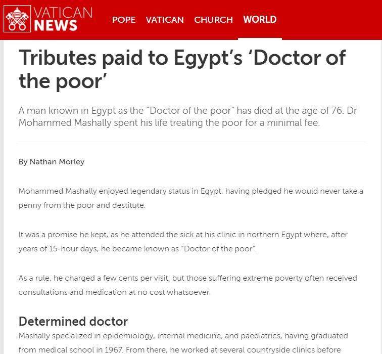 نعى الفاتيكان عبر موقعه الإلكتروني "الفاتيكان نيوز" الطبيب المصري الراحل محمد مشالي والمعروف باسم "طبيب الغلابة".