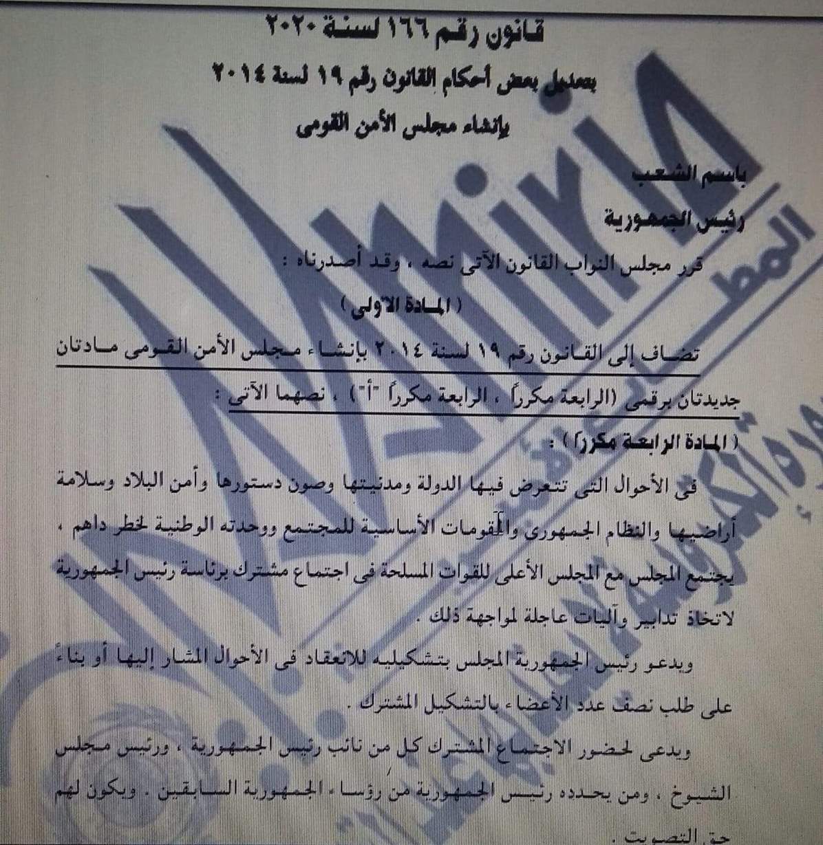 أصدر الرئيس عبد الفتاح السيسي، قانونا جديدا لتعديل بعض المهام الأساسية لمجلس الأمن القومي حيث صدق الرئيس السيسي على القانون رقم ١٦٦ لسنة ٢٠٢٠، بتعديل بعض أحكام القانون رقم 19 لسنة 2014 بإنشاء مجلس الأمن القومي.