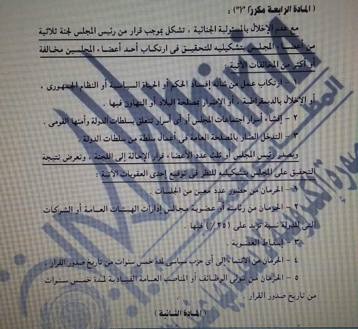 وتضمنت التعديلات مادة خاصة بالجزاءات التي توقع على أعضاء المجلسين حال ارتكاب أي من المخالفات، والتي يأتي في مقدمتها ارتكاب عمل من شأنه إفساد الحكم أو الحياة السياسية أو النظام الجمهوري أو الإخلال بالديمقراطية أو الإضرار بمصلحة البلاد أو التهاون فيها، أو إفشاء أسرار اجتماعات المجلس أو أي أسرار تتعلق بسلطات الدولة وأمنها القومي، التدخل الضار بالمصلحة العامة في أعمال سلطة من سلطات الدولة.