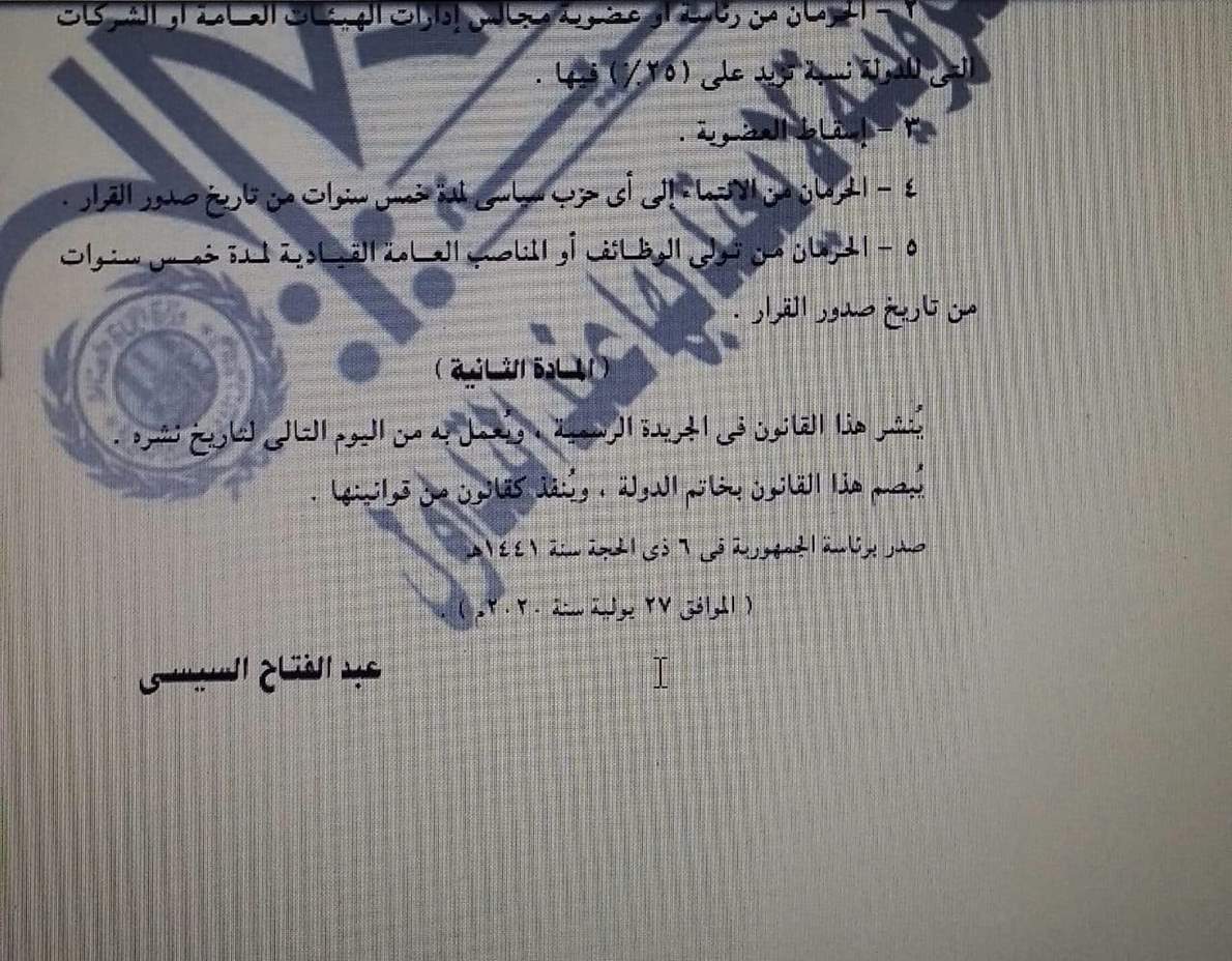 وتقرر أن تكون العقوبات "الحرمان من حضور عدد معين من الجلسات، والحرمان من رئاسة أو عضوية مجالس إدارات الهيئات العامة أو الشركات التي للدولة نسبة تزيد على 25% فيها، إسقاط العضوية، الحرمان من الانتماء إلى أي حزب سياسي لمدة 5 سنوات من تاريخ صدور القرار، والحرمان من تولي الوظائف أو المناصب العامة القيادية لمدة 5 سنوات من تاريخ صدور القرار.