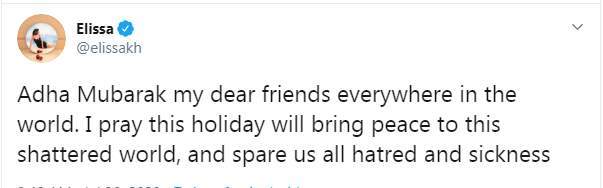وكتبت إليسا تغريدة على تويتر قالت فيها: "أضحى مبارك يا أصدقائي الأعزاء في كل مكان من العالم. وأدعوا لأن يجلب هذا العيد السلام لهذا العالم المحطم. وأن يجنبنا جميعا الكراهية والمرض".