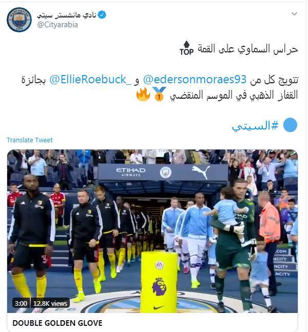 وكتب نادي مانشستر سيتي تغريدة على تويتر "حراس السماوي على القمة.. تتويج كل من @edersonmoraes93 و@EllieRoebuck_ بجائزة القفاز الذهبي في الموسم المنقضي"