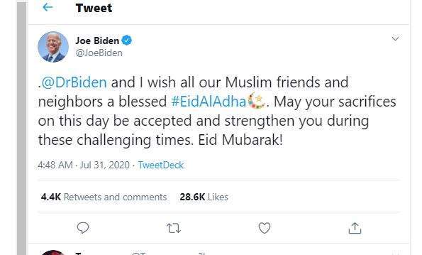 مرشح الرئاسة الأمريكية جو بايدن يهنئ المسلمين بعيد الأضحى