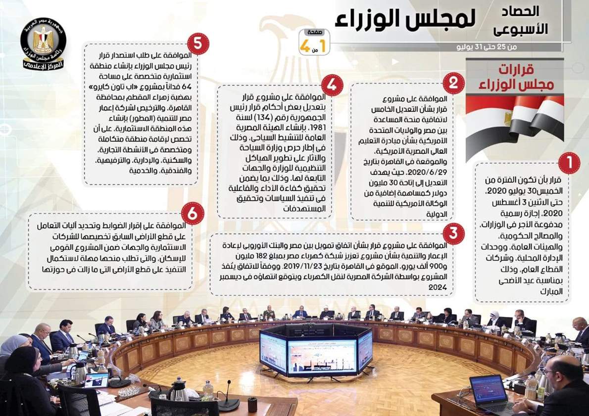 أصدر المركز الإعلامي لمجلس الوزراء، تقريراً تضمن إنفوجرافاً سلط من خلاله الضوء على الحصاد الأسبوعي لمجلس الوزراء، وذلك خلال الفترة من 25 حتى 31 يوليو 2020، والذي تضمن الموافقة على عدد من القرارات، فضلاً عن الاجتماعات التي عقدها الدكتور مصطفى مدبولي، رئيس مجلس الوزراء، بالإضافة إلى ما قام به من أنشطة.