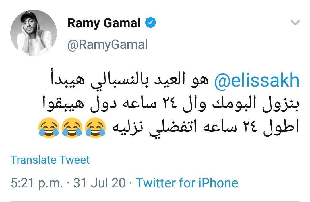 وكتب رامي جمال مشيرا إلى إليسا قائلا: "@elissakh هو العيد بالنسبالي هيبدأ بنزول البومك وال ٢٤ ساعه دول هيبقوا اطول ٢٤ ساعه اتفضلي نزليه".