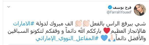 وغردت الفنانة فرح يوسف عبر حسابها الشخصي على موقع التواصل الاجتماعي "تويتر" قائلة:" شي بيرفع الراس بالفعل، الف مبروك لدولة الامارات هالإنجاز العظيم بارككم الله دائماً و وفقكم لتكونو السباقين والأفضل دائماً".