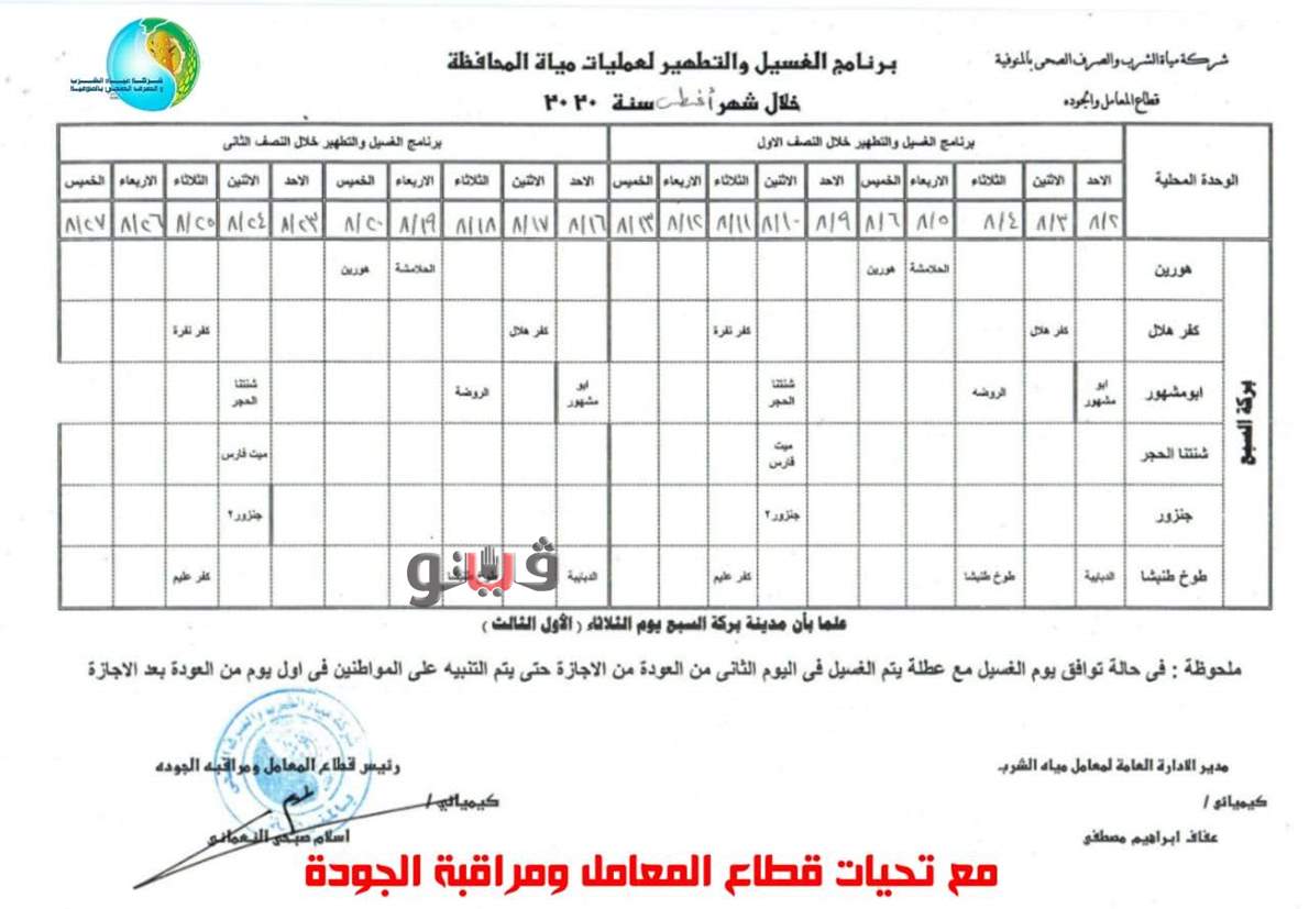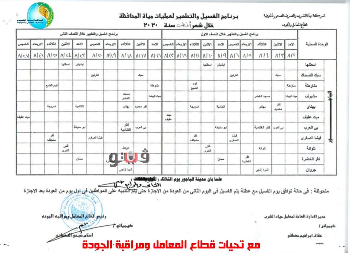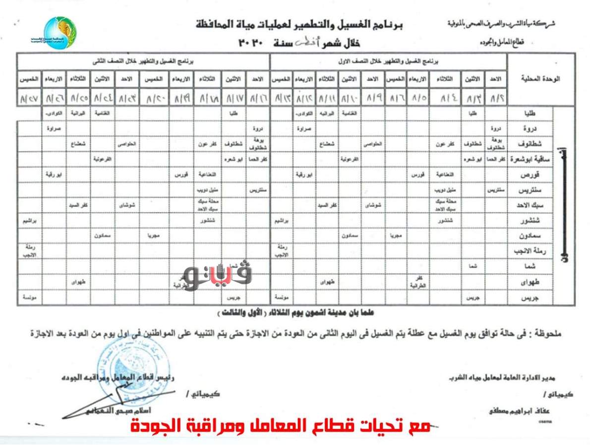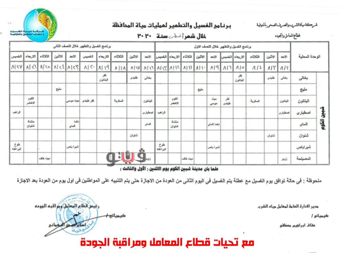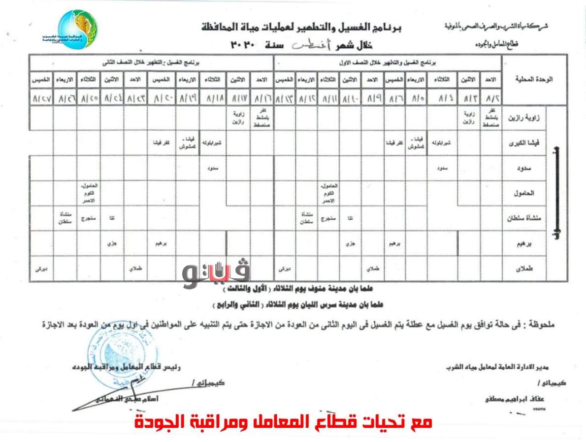 أوضح المهندس محمد نجيب رئيس شركة مياة الشرب والصرف الصحى بالمنوفية بأنه تم تقليل فترة غسيل الشبكات والخزانات بحيث تبدأ من الساعة الثامنة والنصف صباحاً وحتى الواحدة ظهرا من نفس اليوم بدلا من الرابعة والنصف مساءً.