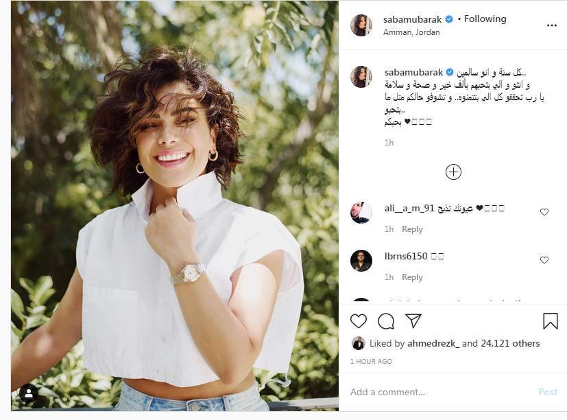 هنأت الفنانة الأردنية صبا مبارك جميع متابعيها بمناسبة حلول عيد الأضحى المبارك، وذلك عبر حسابها الرسمي على موقع الصور والفيديوهات الشهير "إنستجرام".