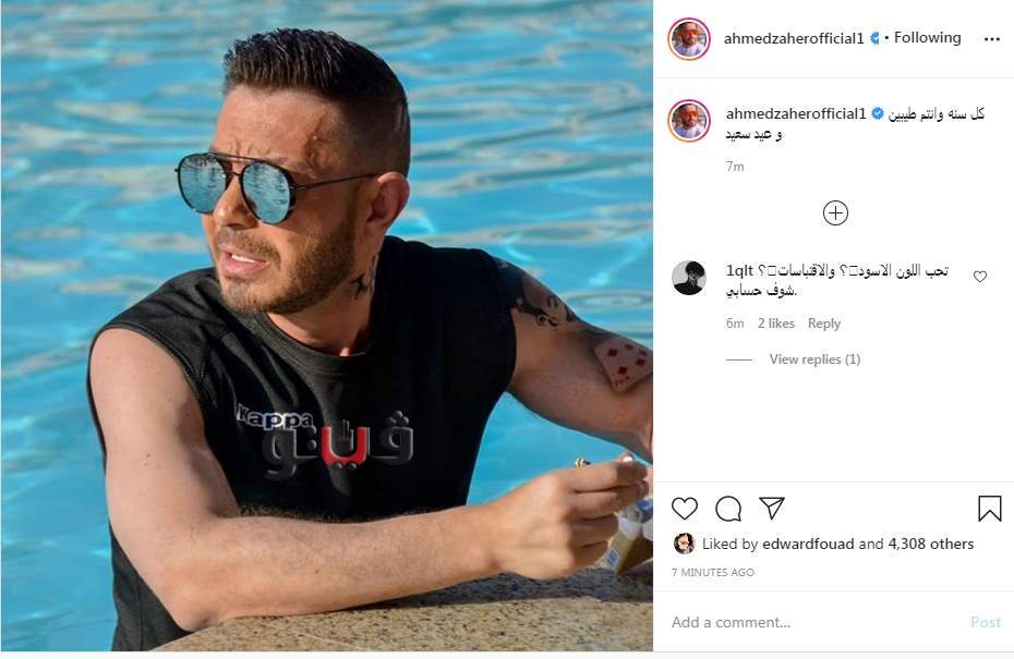 وقام الفنان أحمد زاهر بنشر صورة له وهو بحمام السباحة على موقع التواصل الاجتماعي "إنستجرام" وعلق على الصورة قائلا:"كل سنة وأنتم طيبين و عيد سعيد".