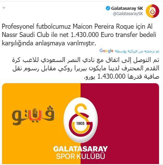 أعلن نادي جالطة سراي التركي، عن المقابل المالي الذي حصل عليه النادي، مقابل رحيل البرازيلي مايكون بيريرا، لصفوف النصر السعودي .