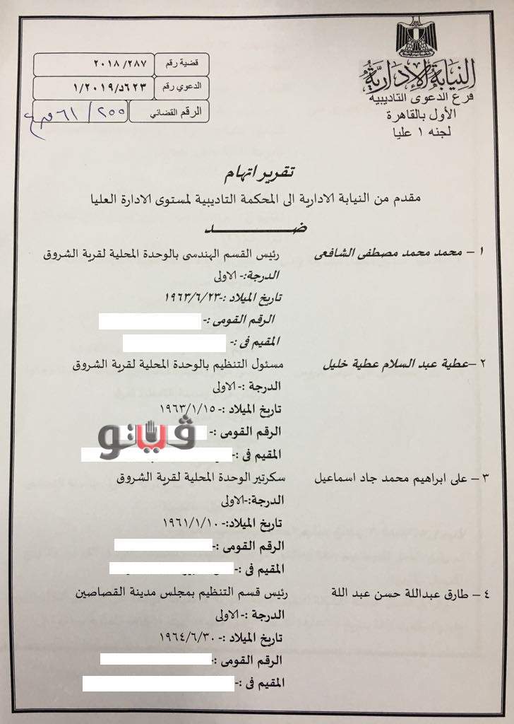 للمحاكمة شملت كلًا من: محمد مصطفى الشافعي، رئيس القسم الهندسي بالوحدة المحلية لقرية