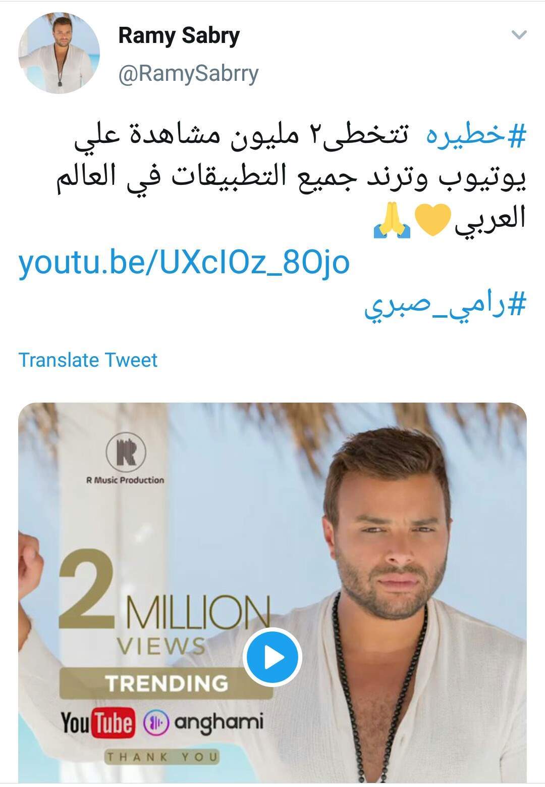 وكتب رامي صبري قائلا: "#خطيره تتخطى٢ مليون مشاهدة على يوتيوب وترند جميع التطبيقات في العالم العربي".