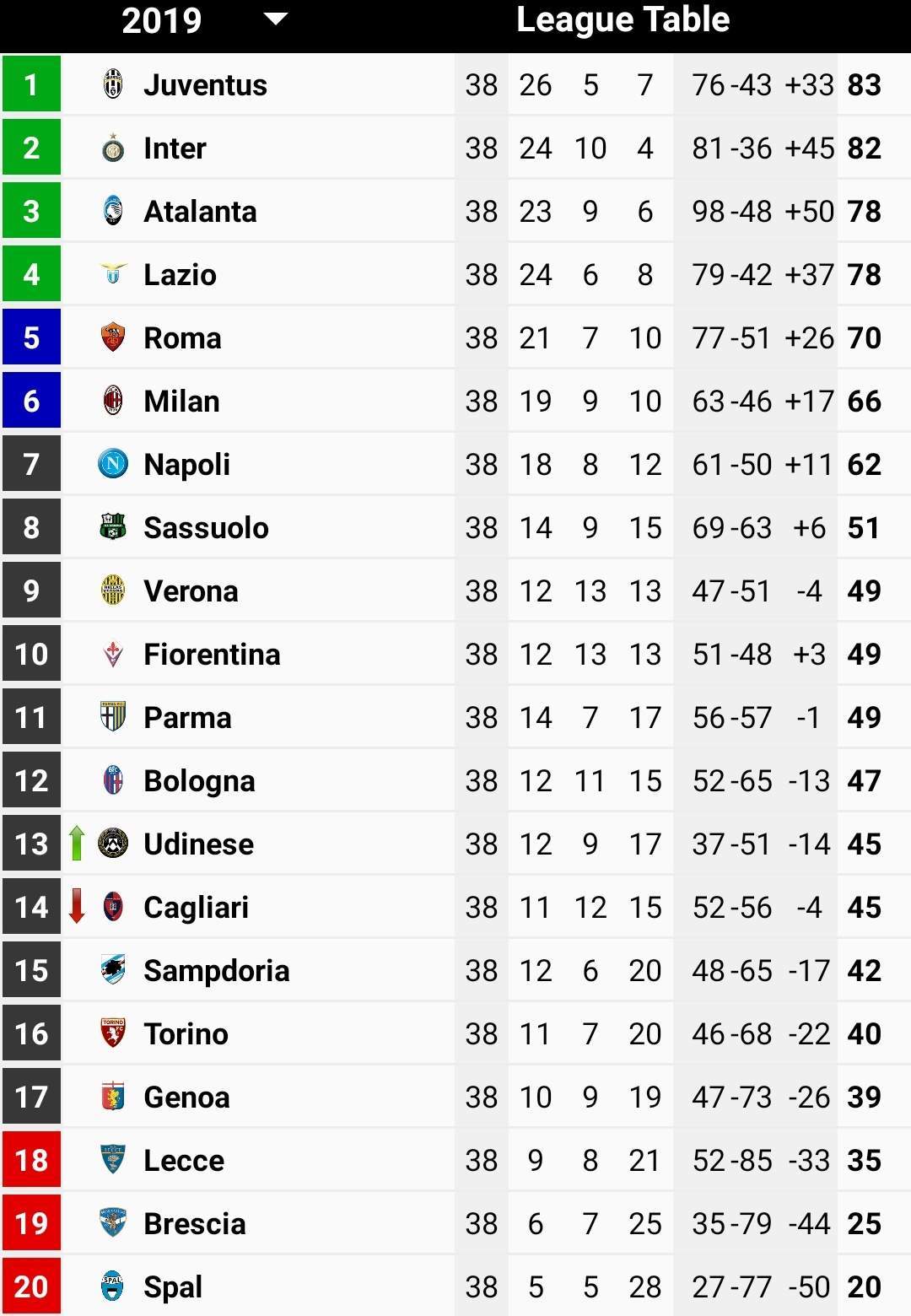وجاء ترتيب الدوري الإيطالي النهائي لموسم 2019-2020 كالتالي: