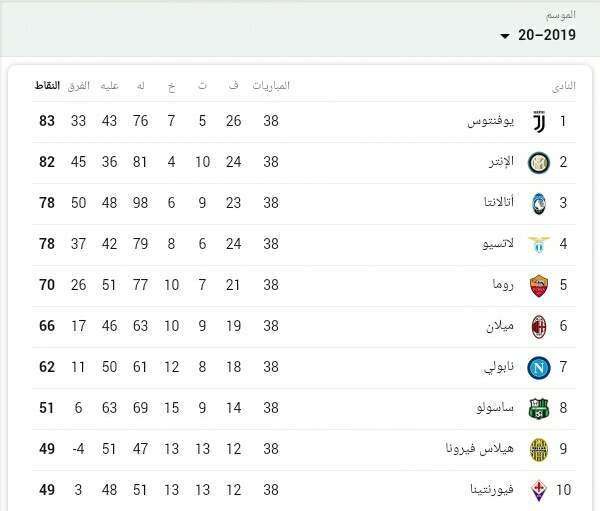 جدول ترتيب الدوري الإيطالي النهائي موسم 2019 - 2020